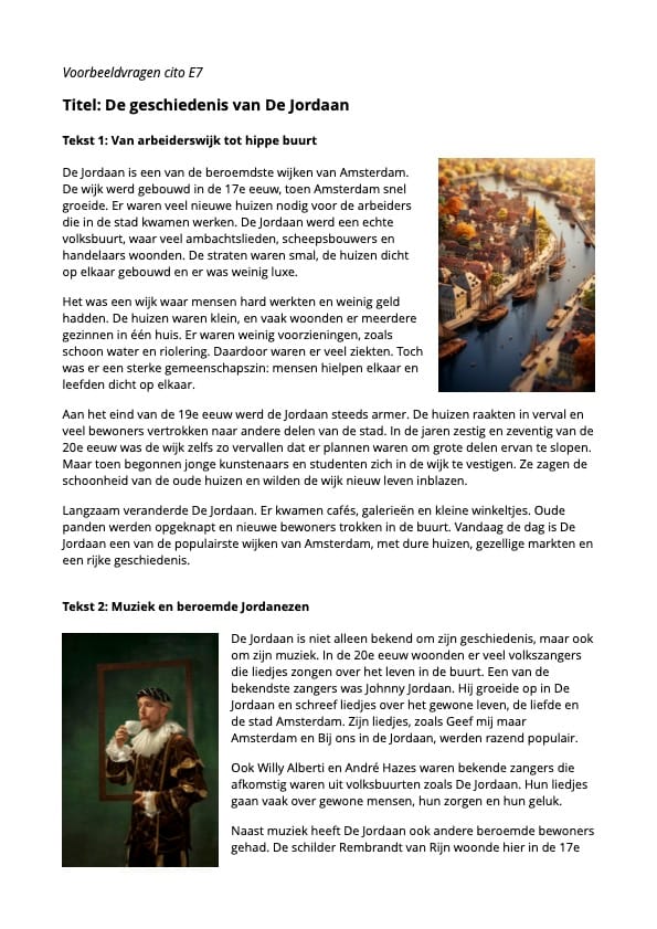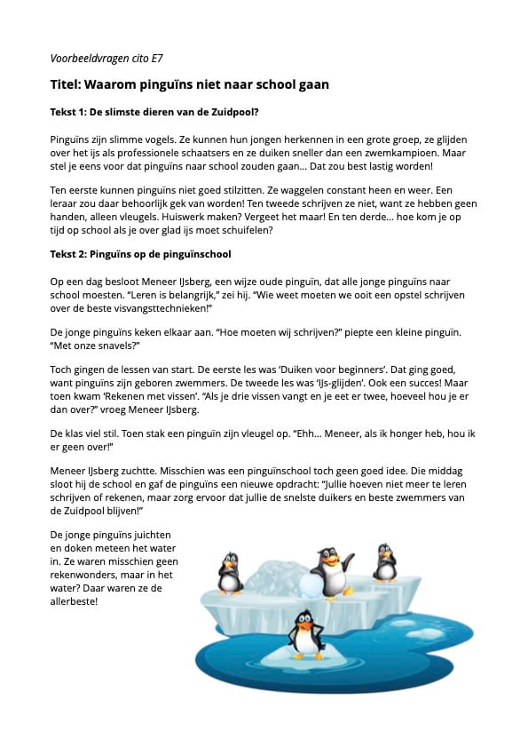 Dit zijn voorbeeldteksten voor cito; op niveau E7. Bij de teksten zitten 20 meerkeuzevragen.